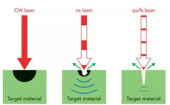 激光以不同的脈沖時間作用到材料商,所產生的效果也是天壤之別: