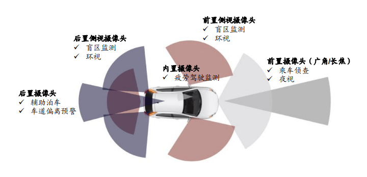 自動輔助駕駛是構架在車載攝像頭這個最重要的光學傳感器上的。從攝像頭來看,光學成像機制可概括為當光線透過鏡片后匯聚在圖像傳感器,傳感器記錄其圖像信息并通過模數轉換器將其轉化為數字信號,然后交由圖像處理器進行后期優化,最終交給圖像處理芯片處理,攝像頭模組的主要構成為CMOS圖像傳感器和鏡頭組。面向高階自動駕駛環境感知需求,攝像頭清晰度變得更高,以探測更長距離和獲取更多信息。