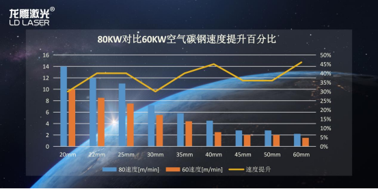 憑借硬件能力的提升,新一代8萬瓦激光切割機的切割性能也有了大幅度提升。與6萬瓦激光切割機對比,在空氣切割20-60mm碳鋼領域,8萬瓦激光速度提升30-50%。而在不銹鋼切割領域,8萬瓦激光切割速度比6萬瓦提升20-30%(20-100mm)。