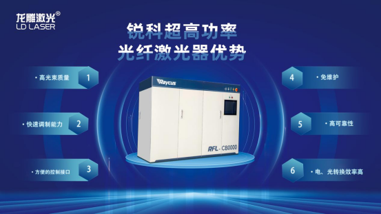 在核心光源方面,龍雕激光選用銳科激光最新發布的80000W超高功率光纖激光器。這款新型激光器擁有更高的光束質量、更高的電光轉換效率以及更高的可靠性,能確保用戶在保證高質高效生產的同時降低耗電量,同時其極佳的可靠性也能夠降低用戶的維護成本。