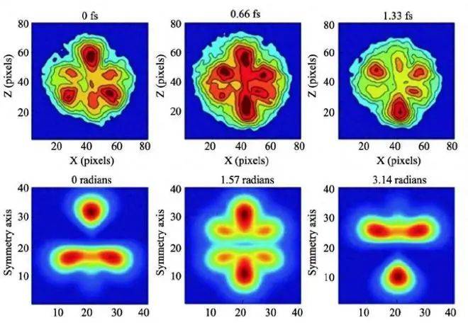 圖 采用阿秒光脈沖串聯(lián)合紅外激光對阿秒電子波包成像的實驗結果(上)和理論結果(下)