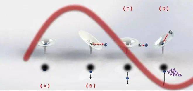 圖 阿秒脈沖產(chǎn)生的三步模型。(A)原子的庫侖場和其中的電子;(B)在強激光場作用下發(fā)生隧穿電離,電子離開原子;(C)脫離原子的電子在強激光場中加速,獲得能量;(D)電子回到原子中,在激光場中獲得的能量以一個極紫外光子的形式釋放出來。