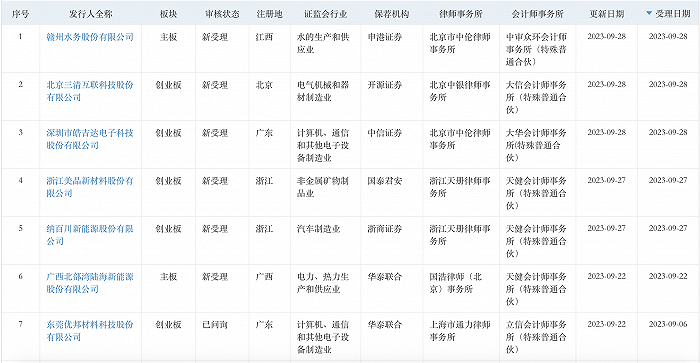 深交所方面,節前一周也共新受理了5家公司,連同此前9月22日和9月6日分別受理的廣西北部灣陸海新能源股份有限公司(下稱陸海新能)、東莞優邦材料科技股份有限公司,深交所9月份共計新受理了7家公司。這7家公司中,陸海新能的融資計劃額16億元為最大,另一家浙江美晶新材料股份有限公司的預計融資金額15個億。