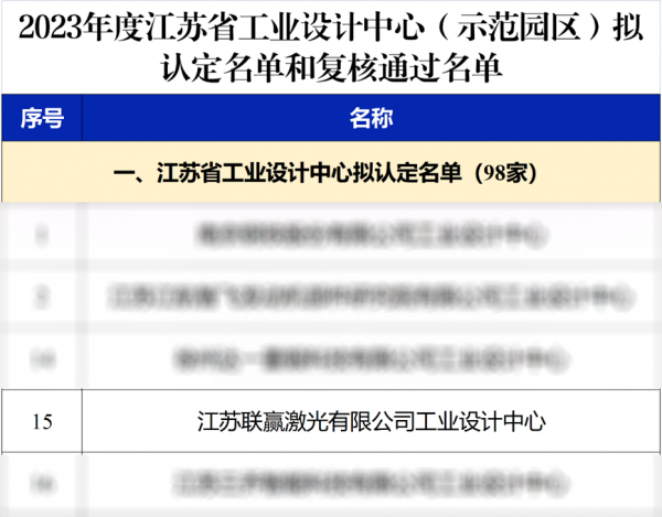 近日,江蘇省工信廳公示了2023年度江蘇省工業(yè)設計中心(示范園區(qū))擬認定和復核通過名單,江蘇聯(lián)贏激光有限公司工業(yè)設計中心憑借完整的工業(yè)設計和突出的科技創(chuàng)新能力成功入選。這是聯(lián)贏激光獲廣東省工業(yè)設計中心、廣東省精密激光焊接裝備工程技術研究中心、廣東省汽車激光智能焊接裝備企業(yè)重點實驗室認定以來,又一個被認定的省級技術創(chuàng)新平臺。