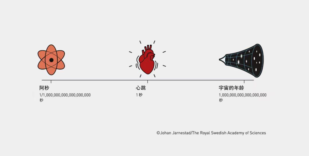 所謂阿秒光脈沖,是指持續時間僅在阿秒量級,即100億億分之一(10-18)秒的光脈沖。人們所說的“快如閃電”,其實,最快的閃電所持續的時間也僅在百分之一到千分之一秒左右。由此,阿秒究竟有多短多快,以人們宏觀的體驗是難以想象的。光在1阿秒時間內所能傳輸的距離僅有0.3納米,約相當于3個氫原子的直徑。如果將1阿秒比之于1秒,那就相當于1秒之于宇宙約140億的年齡。