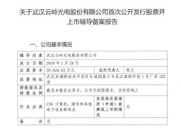 近日,證監會披露了關于武漢云嶺光電股份有限公司首次公開發行股票并上市輔導備案報告。根據報告顯示,9月21日,云嶺光電與海通證券簽署了上市輔導協議。