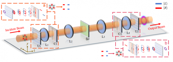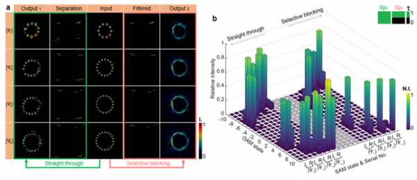相關研究表明,旋轉運動的物體攜帶角動量,而角動量不僅存在于宏觀尺度的物體中,也存在于光子等微觀粒子中。光子所包含的角動量有兩種不同的形式:自旋角動量(SAM)和軌道角動量(OAM)。而光子總角動量(TAM)是傍軸近似下光子SAM與OAM的總和,它提供了兩個自由度,在激光雷達、激光加工、光通信、光計算、量子信息等前沿領域應用前景廣闊。光子TAM態的有效識別與按需控制是其應用的重要基礎,然而現有光子TAM態識別方法仍存在動態范圍有限、識別精度低等問題,且無法按需調控濾波,制約了其應用發展。
