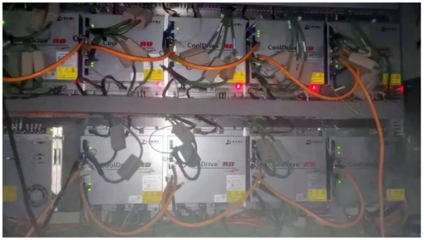 解決方案 CoolDrive RD高性價(jià)比多軸一體伺服驅(qū)動(dòng)產(chǎn)品系列具備極高的性價(jià)比和功率密度,產(chǎn)品采用EtherCAT通信方式,體積小而緊湊,支持多種形式電柜安裝。220V和380V電源電壓等級(jí),2 - 35A輸出電流范圍及2 ~ 6軸的產(chǎn)品多軸行業(yè)定制。搭配TD系列伺服電機(jī),滿足所有輕載工業(yè)機(jī)器人應(yīng)用需求,也可用于半導(dǎo)體設(shè)備,包裝設(shè)備等多軸智能裝備行業(yè)。 瓦楞縱切壓線機(jī)一般為多軸控制,以7刀12線為例,需要使用31臺(tái)伺服電機(jī),如采用傳統(tǒng)的脈沖控制,接線復(fù)雜、容易出錯(cuò),整體成本高。 RD支持EhterCAT總線通訊,采用分布式時(shí)鐘同步,精確同步(<1μs),傳輸速率可達(dá)2×100Mbaud(全雙工模式),實(shí)時(shí)性高, 接線簡(jiǎn)單,維護(hù)方便,避免了脈沖控制方式時(shí)的接線繁瑣,丟脈沖導(dǎo)致定位精度不準(zhǔn),且使用成本低。基于實(shí)時(shí)以太網(wǎng)總線的同步通訊能力,從根本上將設(shè)備的實(shí)時(shí)性和運(yùn)行效率提升到一個(gè)新的臺(tái)階。 現(xiàn)場(chǎng)應(yīng)用 ▲