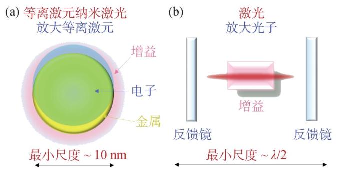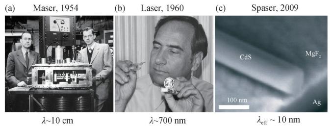關鍵詞 光與物質相互作用,真空零點能,珀塞爾效應,激光微型化,微納激光,等離激元納米激光 01 真空光子態在光輻射中的重要作用與激光微型化 光輻射是由輻射源和其所處的輻射環境共同決定的,對這一光與物質相互作用基本觀點的深刻理解推動了現代物理學的發展。從黑體輻射普朗克定律到費米黃金法則,再到珀塞爾效應與腔量子電動力學,真空光子態在其中均扮演了重要角色(圖1)。 圖1 真空光子態在光輻射中具有重要作用。普朗克黑體輻射定律中的 是真空光子態密度;費米黃金法則中的ρ(v)為光子態密度;光學腔中的光子態密 與真空光子態密度 的比值給出了輻射速率增強的珀塞爾因子 1900年普朗克給出了普朗克黑體輻射定律: 其中S(ν)是黑體單位頻率間隔內輻射的能量密度; 是真空光子態密度,可通過計算一個邊長遠大于自由空間波長的立方體腔的態密度來獲得;hv是單個光子的能量; 是玻色—愛因斯坦統計給出的在能量hv上占據的光子數。光量子假說是愛因斯坦在1905年提出的,而玻色—愛因斯坦統計是在1924年提出的,盡管這些概念在1900年還不存在,但普朗克定律本身表明真空光子態在光輻射中扮演著重要角色。 1916年,愛因斯坦通過研究熱平衡下輻射體吸收與輻射之間的關系,簡潔明確地推導出了普朗克黑體輻射定律,并揭示出了一種新的輻射機制——受激輻射,同時他給出了受激輻射系數與自發輻射系數之間的關系[1]。受激輻射為激光的發明奠定了基礎。對自發輻射的深入理解在量子力學和量子電動力學的建立和發展過程中起到了關鍵作用。在激光發明之后,對自發輻射的深入理解也揭示了激光微型化的重要意義,持續推動了微納激光的發展。 1946年,珀塞爾(E. M. Purcell)指出通過將原子與腔耦合可以改變其自發輻射的速率[2]。珀塞爾當時在研究核磁共振現象,他預測在諧振結構(例如諧振電路)中,原子的自發輻射速率可以被顯著地加快。珀塞爾利用費米黃金法則計算了自發輻射速率并解釋了增強效應。一個輻射源從初始態 到最終態 的自發輻射速率γ可由費米黃金法則計算得到: 其中τsp是輻射源的自發輻射壽命,H是輻射源—光子態相互作用哈密頓量,ρ(v)是光子態密度,這里H的矩陣元是體積歸一化的。在真空中,ρ(v)是 。在有限大小的腔體中,光子態密度從連續變為離散,對于某個光子態(腔模),光子態密度為 ,其中?v=v/Q,Q和Vm是該光子態的品質因子和模式體積。在弱耦合情況下, 與 的比值給出了自發輻射速率的珀塞爾增強因子。 1947年,蘭姆(W. E. Lamb Jr.)實驗上發現了氫原子2S1/2和2P1/2能級之間由于真空光子態的零點能所引起的劈裂(蘭姆位移)[3]。蘭姆位移的發現揭示了真空零點能對光與物質相互作用的重要影響,推動了量子電動力學的發展。 對真空光子態在光輻射中的作用的進一步深刻理解開啟了腔量子電動力學領域。早期的工作包括H. B. G. Casimir和D. Polder在1948年對原子和腔相互作用能的研究[4],以及E. T. Jaynes和F. W. Cummings在1963年對輻射源和高品質因子光腔之間強耦合現象的研究[5]。K. H. Drexhage等人在1966年進行了開創性的實驗工作,觀察到稀土離子熒光壽命可被金屬薄膜調制的現象[6]。1981年,D. Kleppner指出光子態密度的改變不僅可以增強自發輻射還可以抑制自發輻射[7]。為了實現抑制效應,他提出了將輻射源與低于截止頻率的波導耦合的方案。低于截止頻率時,波導的態密度遠小于自由空間的光子態密度,因此可以大幅度地抑制自發輻射。 1983年,P. Goy等在里德伯原子與毫米波光腔耦合系統中觀察到了腔增強的單原子自發輻射[8]。1985年,G. Gabrielse和H. Dehmelt在里德伯原子與微波腔的耦合系統中觀察到了自發輻射被抑制的現象[9]。不久之后,光波段下的自發輻射調制在原子—光學腔耦合系統中被成功實現[10,11]。輻射源—光腔耦合腔量子電動力學系統的發展使得測量和操控單個光子的量子特性成為可能,相關研究獲得了2012年諾貝爾物理學獎。 由于自發輻射在發光二極管、激光、光電探測器和太陽能電池等半導體光電器件中起著關鍵作用,固態系統中自發輻射的調控也引起了學界的極大關注[12—15]。 在1990年前后,人們發現激光的閾值和調制速率會受到激光尺寸的影響[16—19]。首先,微型化激光具有更小的增益材料體積和更大的自發輻射耦合因子,因此其閾值可以更低。同時,微型化激光具有更快的自發輻射以及受激輻射速率,因此其調制速率更快。自那時起,實現體積更小、閾值功耗更低、調制速率更快的微型化激光一直是相關領域研究的焦點。 02 激光微型化:從微波激射器、激光到表面等離激元納米激光 2.1 微波激射器 1954年,J. P. Gordon,H. J. Zeiger和C. H. Townes實現了微波激射器(microwave amplification by stimulated emission of radiation,Maser)[20]。他們利用處于激發態的氨分子作為增益介質,并使用約12 cm長的微波腔提供反饋,實現了波長約為12.56 cm的微波激射(圖2(a))。1958年,A. L. Schawlow和C. H. Townes提出了以鉀蒸汽作為增益介質實現紅外和可見光波段微波激射器(infrared and optical Masers)的設想[21]。由于紅外和可見光波段的波長比微波小得多,受到微納加工能力的限制,那時幾乎不可能實現腔長與激光波長同量級的激光,他們提出利用厘米級光學腔的高階模式來實現激射。 圖2 激光微型化之路 (a)微波激射器(Maser)[20];(b)激光(Laser)[22];(c)等離激元納米激光(Spas
