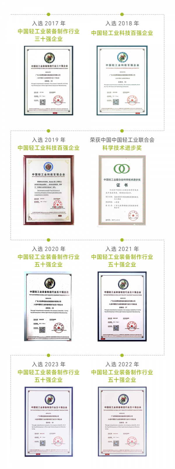 憑借雄厚的企業實力和強大的行業影響力,粵銘激光集團及旗下子公司多次參與國家標準、行業標準和團體標準的評定工作,并連續多年獲評“中國輕工業裝備制造行業五十強企業”、“中國輕工業科技百強企業”、“中國輕工業聯合會科學技術進步獎”等榮譽稱號,凸顯了集團在輕工業領域的引領型實力和地位,同時為輕工業企業提升品牌競爭力起到示范引領和帶動作用。