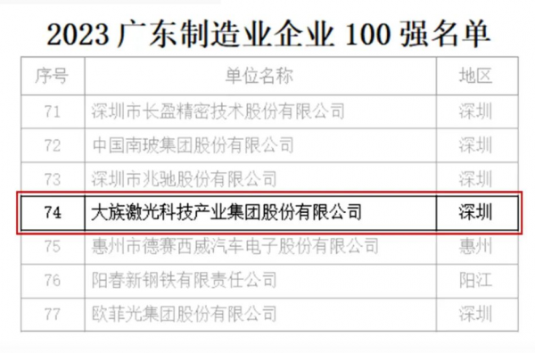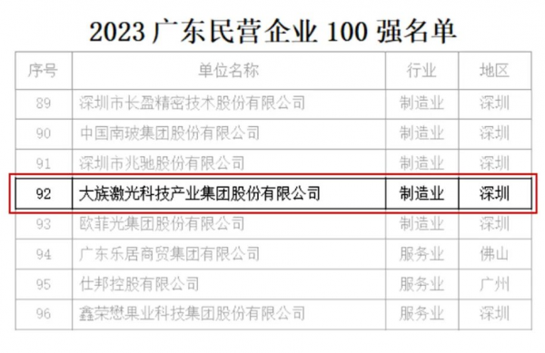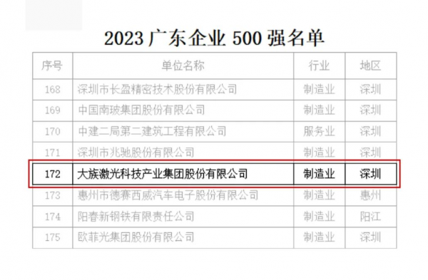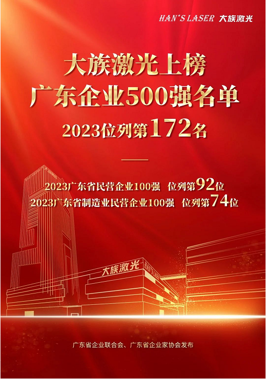 近日,廣東省企業聯合會、廣東省企業家協會在廣州舉辦2023廣東500強企業發展大會,此次大會以“強化龍頭引領,推動產業升級”為主題,正式發布2023廣東企業500強榜單。大族激光憑借雄厚的綜合實力和穩健表現,入圍廣東企業500強,同時上榜2023廣東省民營企業100強和2023廣東省制造業民營企業100強,分別位列92名、74名。