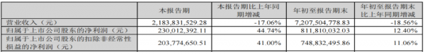10月26日,華工科技產(chǎn)業(yè)股份有限公司(以下簡(jiǎn)稱(chēng)“華工科技”)發(fā)布了2023年三季度業(yè)績(jī)快報(bào)稱(chēng)。報(bào)告期內(nèi),華工科技實(shí)現(xiàn)營(yíng)收21.84億元,同比下降17.06%;歸屬于上市公司股東的凈利潤(rùn)2.30億元,同比增長(zhǎng)44.74%。公司前三季度共營(yíng)收72.08億元,同比下降18.56%;歸屬于上市公司股東凈利潤(rùn)8.12億元,同比增長(zhǎng)12.40%。