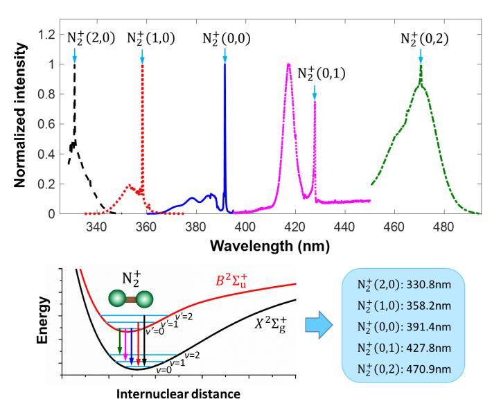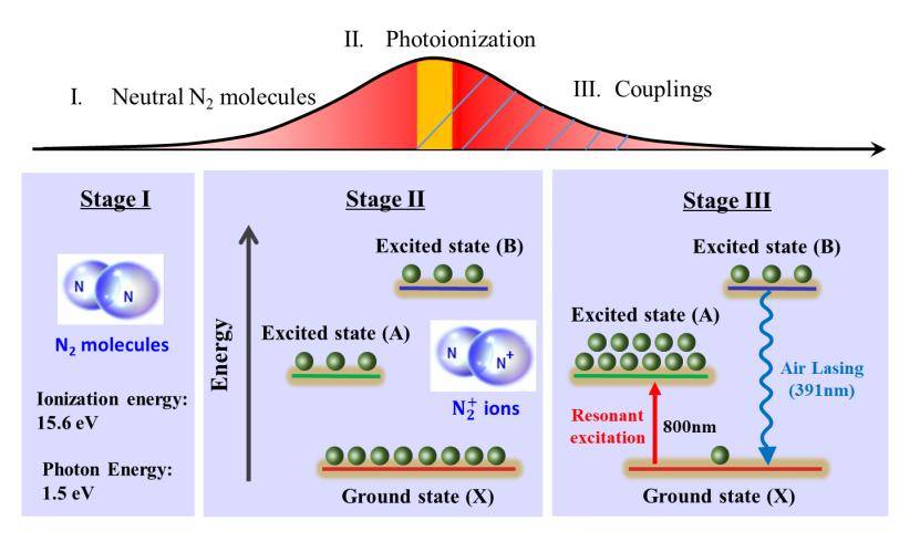 氮氣離子空氣激光是復(fù)雜光場與分子相干波包多體相互作用的結(jié)果。在該過程中,氮氣離子的電子態(tài)、 振動態(tài)、轉(zhuǎn)動態(tài)均被相干激發(fā)且不同自由度間相互耦合,不同激發(fā)自由度對氮氣離子激光增益的貢獻相互交織,核心機制難以甄別。因此,強場電離誘導(dǎo)的空氣激光現(xiàn)象被報道后,其增益機制眾說紛紜,莫衷一是。