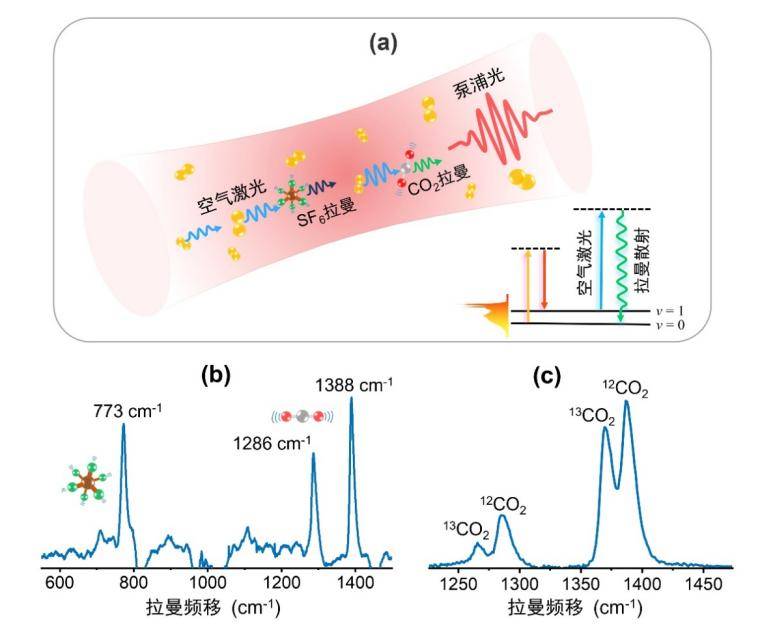 基于空氣激光的多組分大氣分子靈敏檢測的基本原理如圖4(a)所示。當(dāng)一束短脈沖強激光聚焦到空氣中,不僅可以激發(fā)大氣中污染物分子和溫室氣體的相干振動,而且還能夠建立光學(xué)增益產(chǎn)生空氣激光。當(dāng)焦點區(qū)產(chǎn)生的空氣激光遇到相干振動的分子,就會散射出新的波長,產(chǎn)生相干拉曼信號。通過記錄拉曼信號與空氣激光的頻移,即“拉曼指紋”,便可以獲得每種分子特有的“身份”信息。