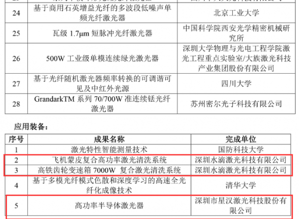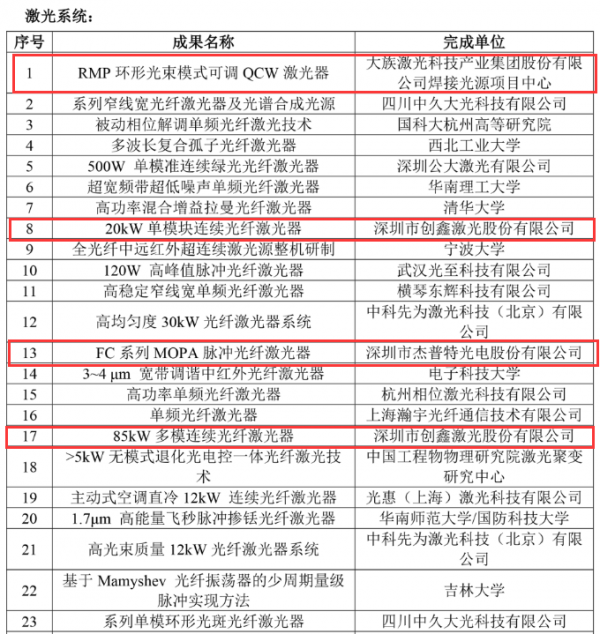 可喜的是,深圳市激光智能制造行業協會5家會員單位在列,其中,副會長單位大族激光的“RMP環形光束模式可調QCW激光器”、副會長單位杰普特的“FC系列MOPA脈沖光纖激光器”、以及會員單位創鑫激光的“20kW單模塊連續光纖激光器”、“85kW多模連續光纖激光器”入選激光系統提名名單,另外,副會長單位水滴激光的“飛機蒙皮復合高功率激光清洗系統”、“高鐵齒輪變速箱7000W復合激光清洗系統”與會員單位星漢激光的“高功率半導體激光器”則入選應用裝備提名名單。