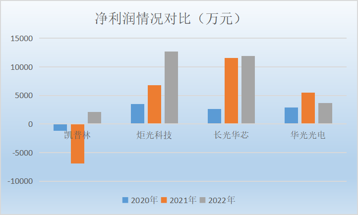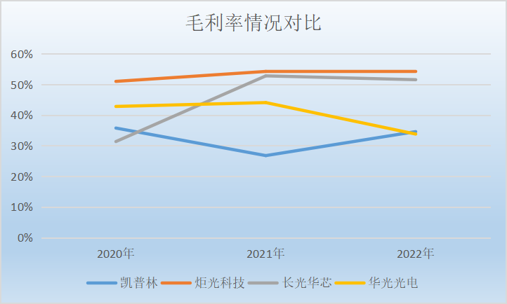對比同行的業績情況發現,凱普林業務規模較大,但盈利水平較低;炬光科技營收、凈利潤均保持持續增長趨勢;而長光華芯2022年營收已經出現下滑,凈利潤略有增長;華光光電的業務規模偏小,2022年毛利率也大幅下滑,在同行中處于墊底水平。