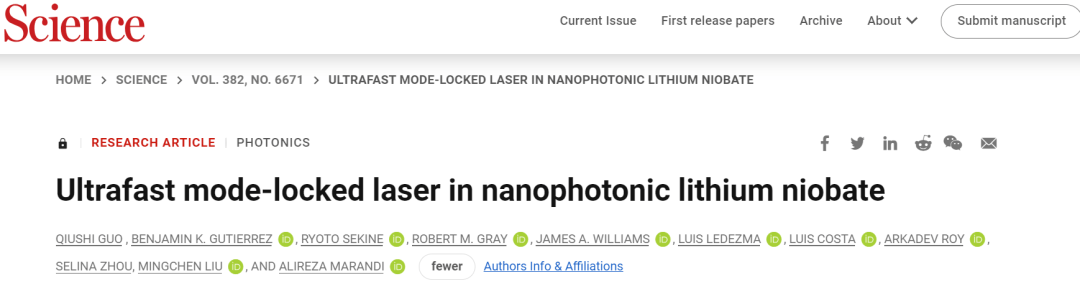 近日,相關(guān)論文以《鈮酸鋰納米光子學(xué)超快鎖模激光器》(Ultrafast mode-locked laser in nanophotonic lithium niobate)為題,作為封面論文在 Science 發(fā)表[1]。紐約市立大學(xué)先進(jìn)科學(xué)研究中心助理教授郭秋實(shí)為該論文第一作者兼共同通訊作者,加州理工學(xué)院助理教授阿里雷薩·馬蘭迪(Alireza Marandi)為論文共同通訊作者。