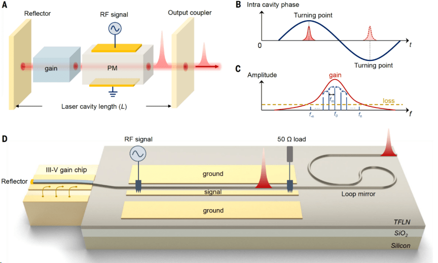 激光器鎖模可以分為被動(dòng)鎖模和主動(dòng)鎖模兩種機(jī)制。研究人員在激光諧振腔內(nèi)加入基于薄膜鈮酸鋰的電光相位調(diào)制器(如下圖 A 所示),實(shí)現(xiàn)了激光的主動(dòng)鎖模。