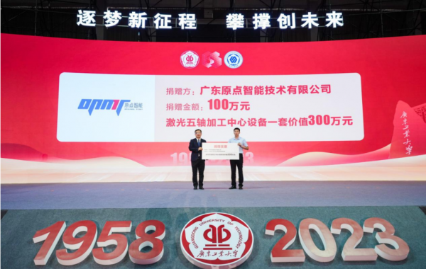 近日,在廣東工業大學(以下簡稱“廣工大”)機電工程學院本科辦學65周年校慶慶典的捐贈儀式上,廣東原點智能技術有限公司(以下簡稱“原點智能”)向高性能工具全國重點實驗室(廣工大)捐贈100萬元人民幣及價值300萬元的激光五軸加工中心一臺,用以支撐實驗室開展前沿的激光工藝技術研究。