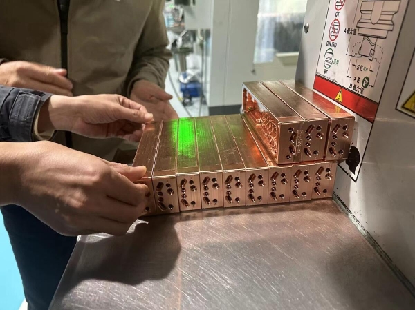 走進熱刺激光的機加工車間,眼前幾十臺加工設備正閃著綠燈快速運轉,一條條紫銅原料通過自動化設備一路完成開粗、打孔、精加工等環節,成為形似插線板的泵浦源外殼。