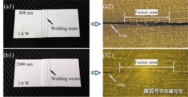 圖片:0.808μm和2μm激光焊接白色PP結果:(a1,b1)實物圖;(a2,b2)截面切片顯微圖