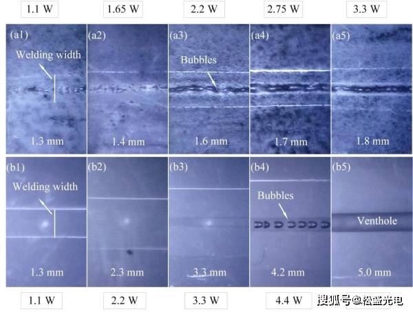上圖中,兩組樣品的融化區都隨著輸入功率的增大而加寬。注意到,部分樣品的焊縫中心出現了氣泡。氣泡對焊接件的氣密性有消極的影響,理想的焊接結果應是形成與母材無異的、無氣泡或雜質的焊縫。然而,與碳黑焊接的樣品因局部(碳黑絮團)吸收能量相對較大,在較低輸入功率(2.2W)時就已經出現因熱分解而產生的氣泡,但無吸收劑焊接的樣品因無高吸收率的碳黑,在線能量較高(4.4W)時才出現氣泡,表明在相同線能量下,采用2μm激光焊接的透明PET樣品更不易出現氣孔缺陷。