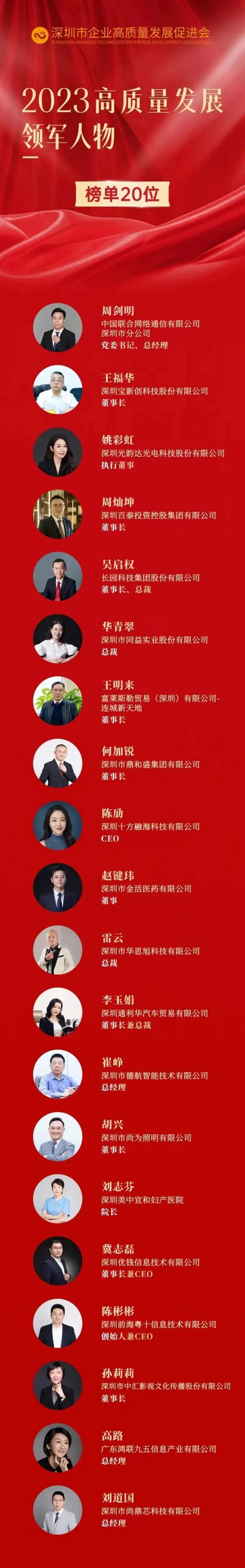 高質(zhì)量發(fā)展領(lǐng)軍人物頒獎典禮該項榜單由深圳市企業(yè)高質(zhì)量發(fā)展促進(jìn)會聯(lián)合哈爾濱工業(yè)大學(xué)(深圳)深圳高質(zhì)量發(fā)展與新結(jié)構(gòu)研究院評選發(fā)布,旨在以科學(xué)研究、精準(zhǔn)分析和高效服務(wù)來洞悉深圳產(chǎn)業(yè)發(fā)展新動能、新優(yōu)勢,助力深圳企業(yè)不斷開辟新領(lǐng)域、新賽道,進(jìn)一步推動深圳企業(yè)在高質(zhì)量發(fā)展道路上行穩(wěn)致遠(yuǎn)。