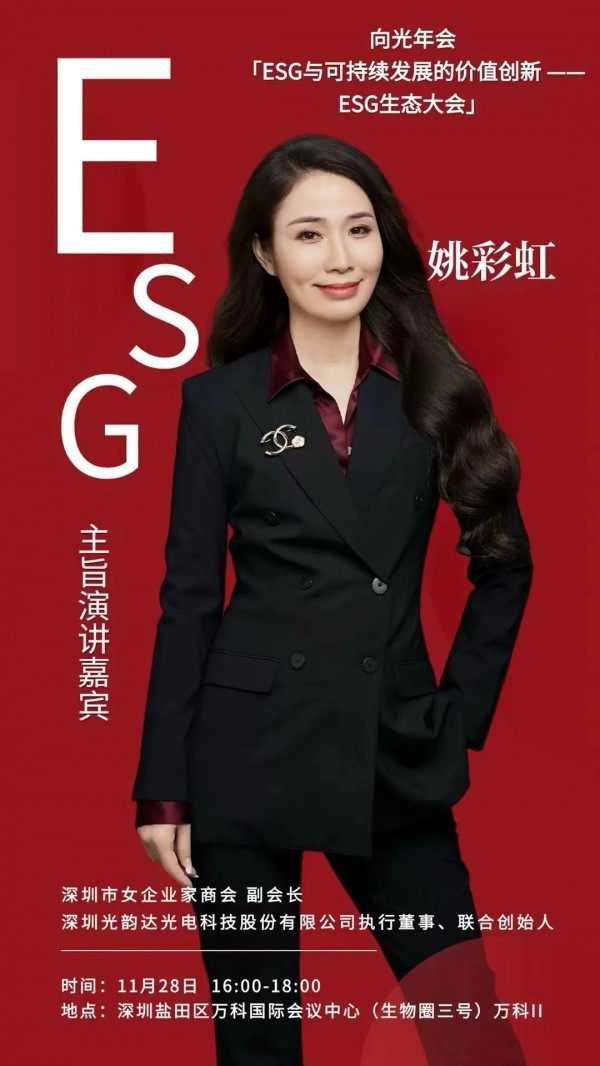 11月28日下午,2023向光年會丨ESG與可持續(xù)發(fā)展的價值創(chuàng)新——ESG生態(tài)大會現(xiàn)場拉開帷幕,深圳光韻達(dá)光電科技股份有限公司聯(lián)合創(chuàng)始人、執(zhí)行董事姚彩虹女士受邀出席參加主旨演講和圓桌對話。
