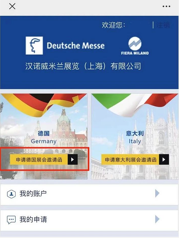 2. 注冊/登錄頁面,點擊“申請德國展會邀請函”