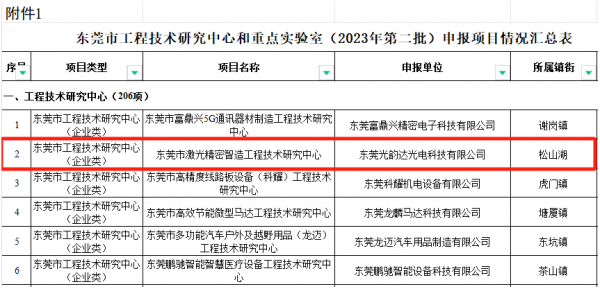 東莞光韻達光電科技有限公司憑借其卓越的技術實力和創新能力,成功入選“東莞市工程技術研究中心和重點實驗室(2023年度第二批)認定項目名單”。