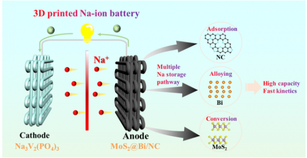 鈉離子電池作為最有吸引力的大規模儲能設備之一,需要解決容量與倍率性能之間的權衡問題。本研究將具有混合儲鈉機制的電極材料和高精度電極制備工藝3D打印技術應用于鈉離子電池,設計了一種三元復合物MoS2@Bi/NC,實現了高可逆容量(在0.1 A g-1下為604 mAh g-1,初始輸出為709 mAh g-1)和優異的倍率性能(在15 A g-1下為169.6 mAh g-1)。通過合理設計結構和界面工程,有效地協同了MoS2的轉化型特性、Bi的合金型特性以及N摻雜碳的吸附型特性。基于3D打印技術對電極結構精細調控制備鈉離子全電池,負載質量11.7mg cm-2的情況下,1.0 A g-1時具有114 mAh g-1的容量。這項工作將促進3D打印鈉離子電池器件的設計,充分發揮混合儲鈉機制的優勢,為鈉離子電池的制備提供新的思路。