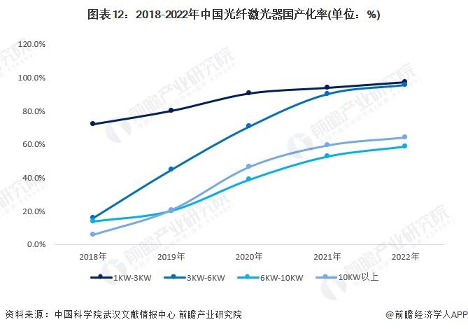 根據(jù)中國(guó)科學(xué)院武漢文獻(xiàn)情報(bào)中心發(fā)布的數(shù)據(jù),從市場(chǎng)滲透率來(lái)看,在 1-3KW 功率段光纖激光器市場(chǎng),2022 年國(guó)產(chǎn)光纖激光器市場(chǎng)份額達(dá) 97.3%,已基本實(shí)現(xiàn)國(guó)產(chǎn)化 ; 在 3-6KW 功率段光纖激光器市場(chǎng),國(guó)產(chǎn)激光器滲透率由 2018 年的 15.8% 迅速提升至 2022 年的 95.7%; 在 6-10KW 功率段光纖激光器市場(chǎng),2022 年國(guó)產(chǎn)滲透率達(dá)到 58.6%。在 10KW 以上功率段光纖激光器市場(chǎng),國(guó)產(chǎn)激光器滲透率更是從 2018 年的 5.7% 快速增長(zhǎng)至 2022 年的 64.1%。3~10kW 產(chǎn)品段國(guó)內(nèi)市場(chǎng)的競(jìng)爭(zhēng)趨于白熱化,價(jià)格戰(zhàn)主戰(zhàn)場(chǎng)也從 1-3kW 產(chǎn)品段,轉(zhuǎn)移至 6-10kW 產(chǎn)品段,萬(wàn)瓦級(jí)成了各廠家角力的焦點(diǎn),光纖激光器國(guó)產(chǎn)替代的趨勢(shì)也逐漸向萬(wàn)瓦延伸。隨著激光器國(guó)產(chǎn)替代的持續(xù)推進(jìn),未來(lái)我國(guó)激光產(chǎn)業(yè)國(guó)產(chǎn)替代是必然趨勢(shì)。