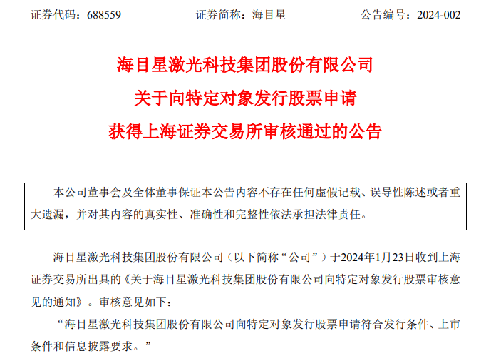 1月23日晚間,海目星激光科技集團股份有限公司(簡稱“海目星”,688559.SH)發布關于向特定對象發行股票申請獲得上海證券交易所審核通過的公告。海目星于2024年1月23日收到上海證券交易所出具的《關于海目星激光科技集團股份有限公司向特定對象發行股票審核意見的通知》。審核意見如下:“海目星激光科技集團股份有限公司向特定對象發行股票申請符合發行條件、上市條件和信息披露要求。” 中信證券股份有限公司關于海目星激光科技集團股份有限公司向特定對象發行股票之上市保薦書顯示,中信證券股份有限公司為保薦機構(主承銷商),中信證券指定彭立強、王楠楠作為本次證券發行項目的保薦代表人。 海目星激光科技集團股份有限公向特定對象發行A股股票預案(二次修訂稿)顯示,本次向特定對象發行股票募集資金總額不超過196,430.00萬元(含本數),扣除發行費用后的募集資金凈額計劃用于西部激光智能裝備制造基地項目(一期)、海目星激光智造中心項目、補充流動資金項目。 本次向特定對象發行股票的種類為境內上市的人民幣普通股(A股),每股面值為人民幣1.00元。本次發行將全部采用向特定對象發行A股股票的方式進行,將在中國證監會同意注冊后的有效期內選擇適當時機向特定對象發行。 本次發行對象為不超過35名特定投資者,包括符合中國證監會規定條件的證券投資基金管理公司、證券公司、信托公司、財務公司、資產管理公司、保險機構投資者、合格境外機構投資者、其他境內法人投資者、自然人或其他合格投資者。證券投資基金管理公司、證券公司、合格境外機構投資者、人民幣合格境外機構投資者以其管理的二只以上產品認購的,視為一個發行對象;信托投資公司作為發行對象的,只能以自有資金認購。所有發行對象均以人民幣現金方式并以同一價格認購公司本次發行的股票。 本次向特定對象發行股票采取詢價發行方式,本次向特定對象發行的定價基準日為發行期首日。本次發行的發行價格不低于定價基準日前20個交易日公司股票交易均價的80%。 本次發行的股票數量按照募集資金總額除以發行價格確定,同時本次發行股票數量不超過本次向特定對象發行前公司總股本的30%,即本次發行不超過60,517,950股(含本數),最終發行數量上限以中國證監會同意注冊的發行數量上限為準。在前述范圍內,最終發行數量由董事會根據股東大會的授權結合最終發行價格與保薦機構(主承銷商)協商確定。 本次發行完成后,發行對象認購的本次發行的股票自發行結束之日起六個月內不得轉讓。若國家法律、法規、規章、規范性文件及證券監管機構對本次發行股票的限售期有最新規定、監管意見或審核要求的,公司將根據最新規定、監管意見或審核要求等對限售期進行相應的調整。 本次向特定對象發行的股票擬在上海證券交易所科創板上市交易。本次向特定對象發行前的滾存未分配利潤將由本次發行完成后的新老股東共享。 本次向特定對象發行的相關決議有效期自公司股東大會審議通過本次向特定對象發行方案之日起12個月內有效。 截至預案公告日,本次發行尚未確定發行對象,最終是否存在因關聯方認購公司本次向特定對象發行股票構成關聯交易的情形,將在發行結束后公告的發行情況報告書中披露。 截至預案公告日,公司總股本為20,172.65萬股。本次發行前后,公司均無控股股東。本次發行前,公司實際控制人為自然人趙盛宇,其直接持有海目星1.22%股份,并通過盛世海康、海合恒輝一號、海合恒輝二號合計間接控制公司32.53%的股份,合計控制公司33.75%股份。本次發行完成后,假設按發行數量上限60,517,950股計算,實際控制人趙盛宇及其控制的企業合計控制發行人25.96%的股份,趙盛宇仍為公司實際控制人。本次向特定對象發行股票不會導致公司控制權發生變化,亦不會導致公司股權分布不具備上市條件。