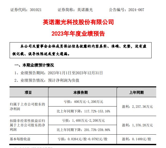 樂居財(cái)經(jīng) 趙盼盼 1 月 31 日,英諾激光 ( 301021.SZ ) 發(fā)布 2023 年度業(yè)績預(yù)告公告。