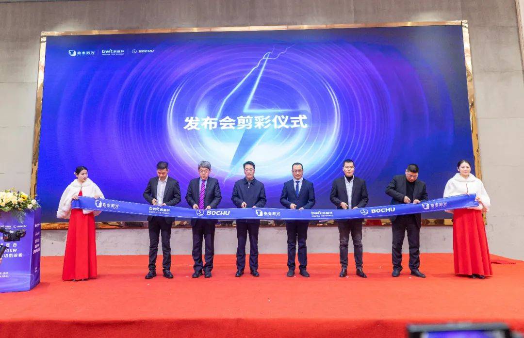 在合作剪彩儀式上,宿城區領導秦永輝,北京工業大學教授王璞、嘉泰激光總經理鄭長和、嘉泰激光研發副總陳大建、嘉泰激光物控副總湯孫槐、凱普林光纖事業部輪值總經理趙巨云共同上臺,宣告雷霆100kW超高功率切割設備正式發布。