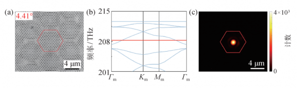 圖1 魔角納米激光 (a)將兩套扭轉的光子晶體晶格置于同一層半導體材料中形成的單層轉角莫爾超晶格的電子顯微鏡照片。兩套光子晶體晶格間的相對轉角為4.41°。紅色六邊形是莫爾超晶格的一個原胞。局域在每個原胞中的莫爾平帶波函數均可被用來構建莫爾納米激光;(b)通過三維全波模擬得到的(a)圖中莫爾超晶格的能帶結構。紅色的能帶為莫爾光學平帶,其在實空間對應著局域化的波函數;(c)利用局域在單個莫爾原胞中的平帶波函數實現的魔角納米激光近場激射圖案