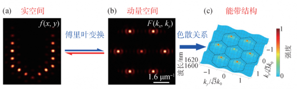 一般而言,當把相同的納米激光排布成陣列時,由于納米激光諧振腔之間的相互耦合,其簡并的頻率會發生劈裂。但由魔角納米激光排布構成的莫爾超晶格中,各納米激光的頻率均對應著莫爾光學平帶,具有頻率簡并的特性。最近,我們利用這一特性實現了莫爾納米激光陣列的相位鎖定和控制,使其能夠生成任意形狀的陣列化相干激射[16]。納米激光陣列實空間和動量空間的電場強度分布由傅里葉變換相互聯系,動量空間分布通過能帶結構對應出頻率分布,莫爾平帶保證了頻率的簡并性,這種簡并特性使得任意形狀納米激光陣列的相干激射成為可能(圖2)。