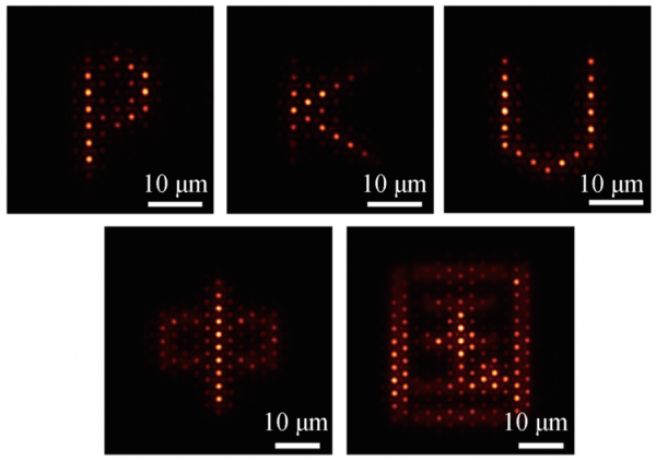 圖3 莫爾納米激光陣列以“P”、“K”、“U”和“中”、“國”圖形生成的陣列化相干激射。由于莫爾平帶的本征能量簡并特性,任意形狀的莫爾納米激光陣列均能夠通過自發相位鎖定產生相干激射