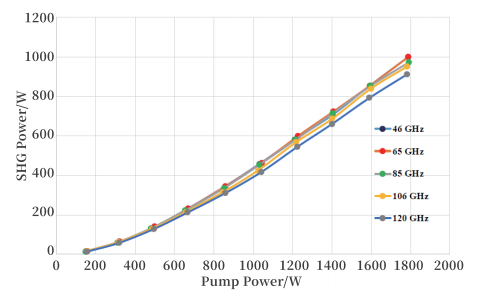 與固體基頻光相比,光纖基頻光的峰值功率較低且不便采用內(nèi)腔倍頻方式,是限制其倍頻綠光輸出的主要因素。隨著窄線寬線偏振光纖激光器輸出功率水平的不斷突破,高效的LBO單通倍頻成為可能。2014年,IPG公司報道對單頻半導(dǎo)體種子源進行相位調(diào)制使其光譜線寬展寬至25 GHz以抑制SBS,可獲得kW級基頻光輸出;用LBO晶體對其進行單通倍頻,實現(xiàn)了功率356 W、倍頻效率35%的綠光輸出[4]。2020年,Nufern公司報道了對1.8 kW的連續(xù)波1064nm基頻光單通倍頻,綠光輸出功率達到1 kW、倍頻效率54%,光束質(zhì)量因子M2僅為1.015[5]。如圖3,由于LBO晶體對1 μm基頻光I類非臨界相位匹配倍頻的允許帶寬很大(~2300 GHz·cm),基頻光光譜線寬從46 GHz展寬至120 GHz并不會明顯影響倍頻效率。因此,該技術(shù)路線還具有進一步適當(dāng)展寬基頻光譜、提高其功率,以優(yōu)化倍頻效率、得到更高功率的連續(xù)波綠光輸出的潛力。國內(nèi)方面,上海光機所也報道了基于該技術(shù)途徑實現(xiàn)610 W綠光輸出的實驗結(jié)果。
