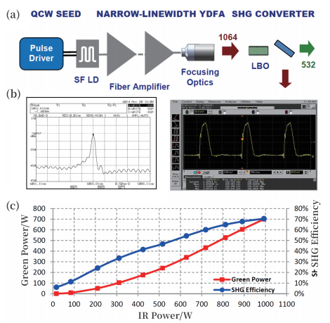 圖4 IPG公司的種子源調(diào)制700 W準(zhǔn)連續(xù)光纖綠光激光器光路示意圖、基頻光譜和波形以及功率曲線[6]