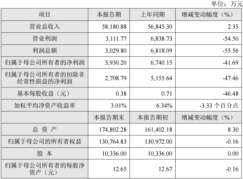 報告期末,公司總資產174,802.28萬元,同比增長8.30%;歸屬于母公司的所有者權益130,764.83萬元,同比下降0.16%。