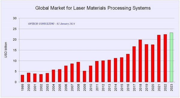 2023 年,全球激光材料加工系統(tǒng)市場呈現溫和增長態(tài)勢,市場規(guī)模將達到 230 億美元。(Optech Consulting 提供。)