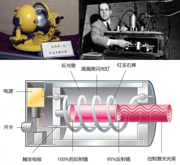 ▲ 我國與世界第一臺紅寶石激光器及原理圖示