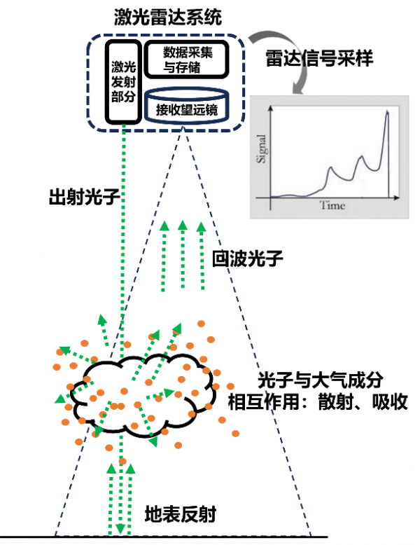激光遙感技術是指用激光作為發射源,對激光經過傳輸介質產生的延時、頻移,以及激光導致介質引起的吸收、散射(包含彈性散射,以及拉曼散射或布里淵散射等非彈性散射)、熒光等信號進行遙測,具備時間分辨和高度分辨測量能力,并從這些信號中反演出介質的物理和光學特性信息的測量技術。下圖為激光雷達系統構成及探測原理示意圖,雷達系統主要由激光發射、望遠鏡接收和數據采集存儲三部分構成。對于每一次探測,首先由發射部分發射窄線寬、高準直和高功率的激光,光子經過大氣,到達地表(包括海洋),在這個傳輸過程中,光子會與大氣成分發生相互作用,被大氣成分吸收和散射(在地表為反射作用),散射(反射)光子由接收望遠鏡接收并進行光學處理,最后數據采集系統完成信號收集和存儲。光子是以光速傳播的,整個探測過程在5毫秒內完成(對于軌道高度約700公里的衛星),激光雷達通過高速數據采集系統(采樣頻率大于兆赫茲)實現高距離分辨率的采樣探測。