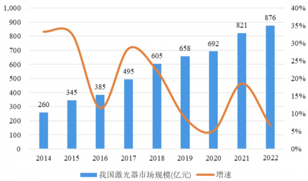 根據(jù)光電匯OESHOW的數(shù)據(jù),以銷售收入為基準(zhǔn)的2021年全球激光器市場(chǎng)規(guī)模達(dá)210.1億美元,同比增長(zhǎng)率為16.40%,2022年全球市場(chǎng)規(guī)模順勢(shì)繼續(xù)增長(zhǎng)至232億美元。我國(guó)激光產(chǎn)業(yè)的發(fā)展速度略高于制造業(yè)的整體發(fā)展速率,以銷售收入為基準(zhǔn)的2021年中國(guó)激光器市場(chǎng)規(guī)模達(dá)821億元,同比增長(zhǎng)17.85%,到2022年中國(guó)激光器市場(chǎng)規(guī)模進(jìn)一步擴(kuò)大至876億元,占據(jù)全球過半份額。