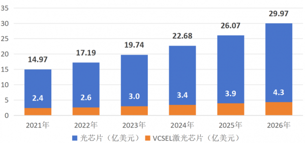 光芯片與光通信和光模塊密不可分。根據(jù)億渡數(shù)據(jù),2021年我國(guó)光芯片市場(chǎng)規(guī)模達(dá)14.97億美元,2015-2021年復(fù)合增長(zhǎng)率達(dá)14.94%,預(yù)計(jì)2026年我國(guó)光芯片市場(chǎng)將增長(zhǎng)至29.97億美元。其中VCSEL激光芯片的需求不斷擴(kuò)大,2021年我國(guó)VCSEL芯片市場(chǎng)規(guī)模約為2.4億美元,占據(jù)光芯片市場(chǎng)的約15%,預(yù)計(jì)至2026年,我國(guó)VCSEL芯片市場(chǎng)規(guī)模將增長(zhǎng)至4.3億美元。