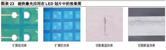 超快激光在顯示照明領域的應用主要是指LED晶片的劃線和切割,這也是超快激光適合硬脆材料加工的又一例證,超快激光加工的截面平整度高,崩邊顯著減少,效率和精度都大大提升。