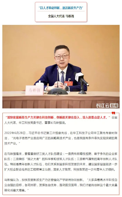 人民日報、新華社、中央電視臺、經濟日報、科技日報、新華網、工業和信息化部宣傳中心、人民郵電報、中國工業報、中國經濟網、證券時報、證券日報、上海證券報、21世紀經濟報、經濟觀察報、湖北日報、極目新聞、長江日報等多家媒體關注馬新強代表的履職情況及華工科技創新發展。