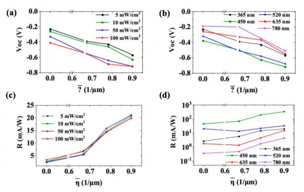 如何誘導可控的大應變梯度,是撓曲電效應研究中的一個關鍵挑戰。相比于傳統體材料,新興的二維范德華材料可以承受更大的形變,研究撓曲電效應對其光電性能的影響,可以為實現高性能微納光電探測器提供一種新的調控手段。 研究團隊表示,通過擬合彎曲異質結的高度曲線可以證明利用直徑為數百納米的ZnO納米線可以在二維材料中產生高達1 μm?1量級的應變梯度場,比傳統三維柔性器件高出約3個數量級,開爾文探針力顯微鏡(KPFM)表面勢測量結果表明強應變梯度場顯著改變了異質結區域的能帶結構。 圖|彎曲α-In2Se3/β-InSe異質結的曲率及表面勢表征 相應的光電性能測試表明,相比平直異質結,平均曲率為0.9 μm?1 的彎曲異質結的開路電壓和零偏壓響應度分別提高了2.48倍和7.62倍。證明了撓曲電效應可以有效提升二維異質結的光電探測性能,撓曲電效應可為高性能微納光電探測器的研制提供一種新的調控手段。 圖|光電性能與應變梯度之間的關系 相關研究成果以“Flexoelectricity-Enhanced Self-Powered Photodetection in 2D van der Waals Heterojunctions With Large Curvatures”為題發表在國際權威期刊《Advanced Functional Materials》(IF:19,Nature Index期刊)上。深圳技術大學副研究員齊魯為第一作者,深圳技術大學阮雙琛教授與深圳大學曾昱嘉教授為共同通訊作者。該項研究得到了國家自然科學基金、廣東省基礎與應用基礎研究基金和深圳市科技計劃等項目支持。
