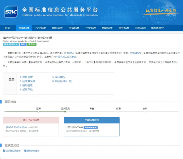 《激光產品的安全 第4部分:激光防護屏》 7. 推薦性國家標準修訂項目“修訂GB/T 7247.4—2016《激光產品的安全 第4部分:激光防護屏》”(計劃編號20232019-T-604),征求意見時間為:2024年3月6日至5月5日。 (請點擊查看??) 關于《激光產品的安全 第4部分:激光防護屏》 推薦性國家標準征求意見的通知 點擊查看標準項目信息:https://std.samr.gov.cn/gb/search/gbDetailed?id=0DF2F13A31F03E55E06397BE0A0A296C